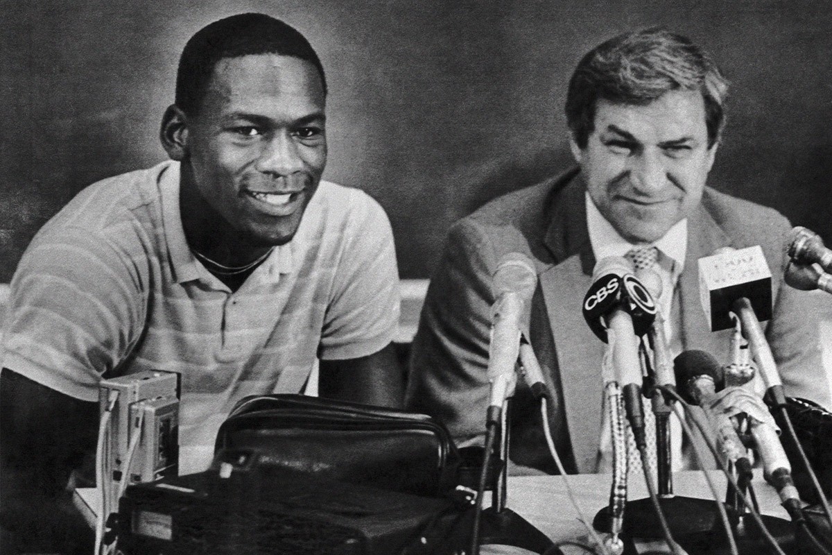 Converse was in the mix as well, with Jordan having worn the Boston brand’s shoes throughout college due to the deal North Carolina coach Dean Smith (pictured with Jordan at a press conference above) had with the company. Converse was prepared to market Jordan alongside its other stars Magic Johnson and Larry Bird, but was offering nothing new in terms of footwear ideas.